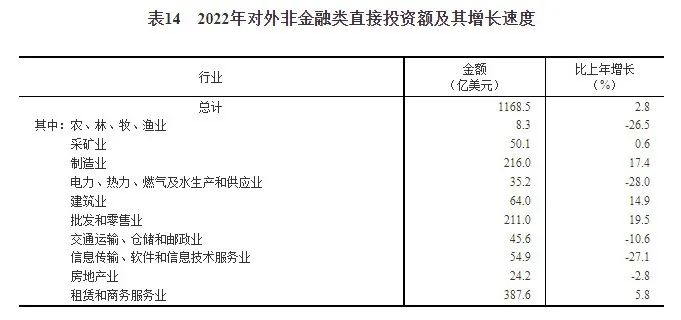 全年對外非金融類直接投資額7859億元,比上年增長7.2%,折1169億美元,增長2.8%。其中,采礦業(yè)2022年對外非金融類直接投資額50.1億美元,比上年增長0.6%。